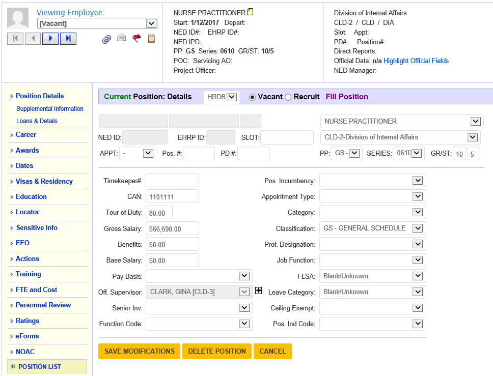 If the position is unfilled, select whether it is a Vacant or Recruit position.