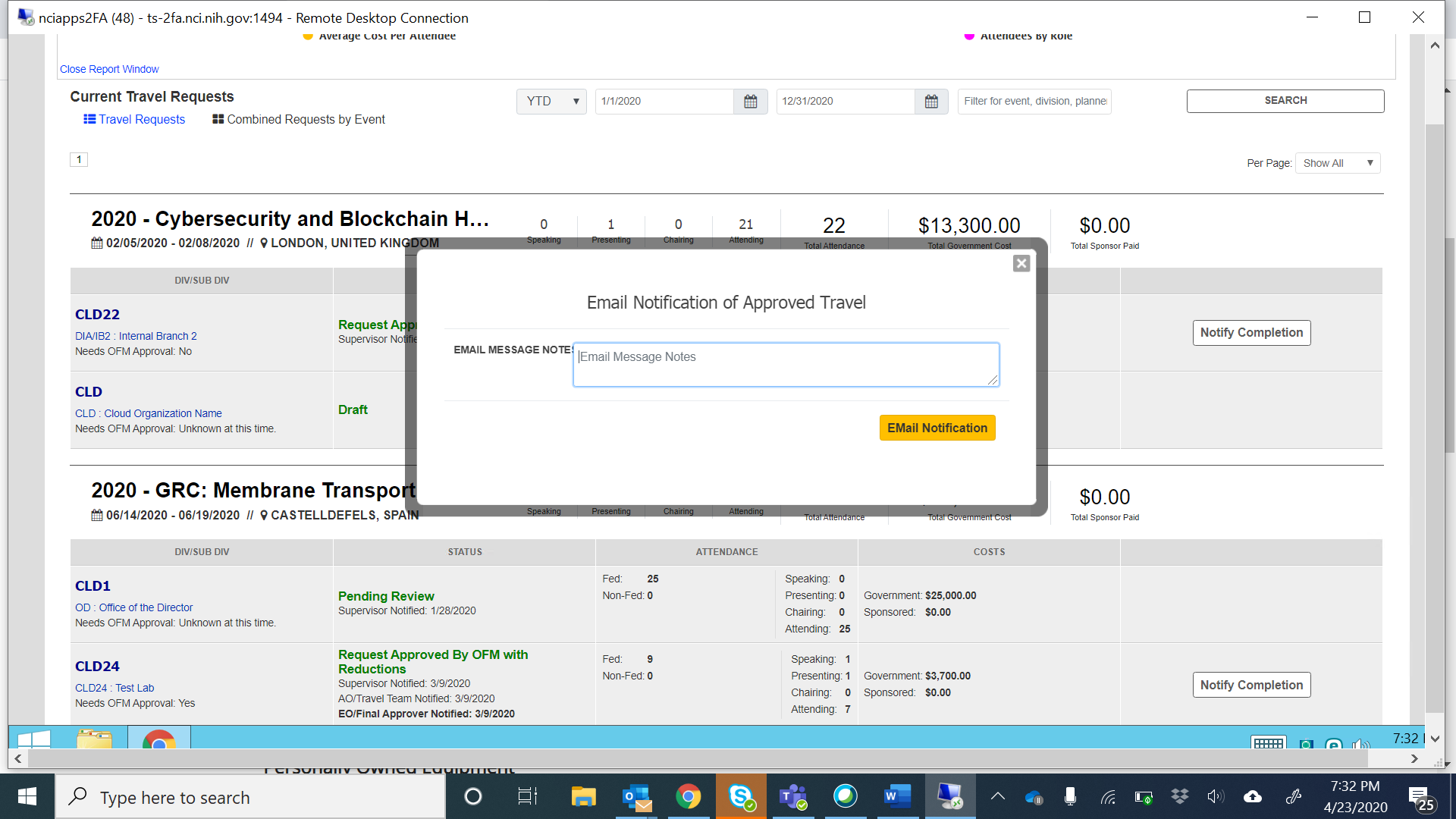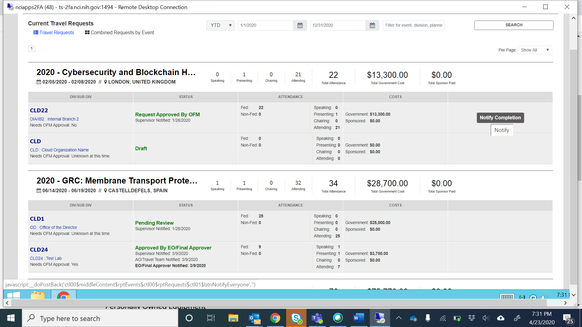 From the Combined Request by Event screen, when a request's status has been changed to approved by OFM a Notify Completion will appear next to the travel request.